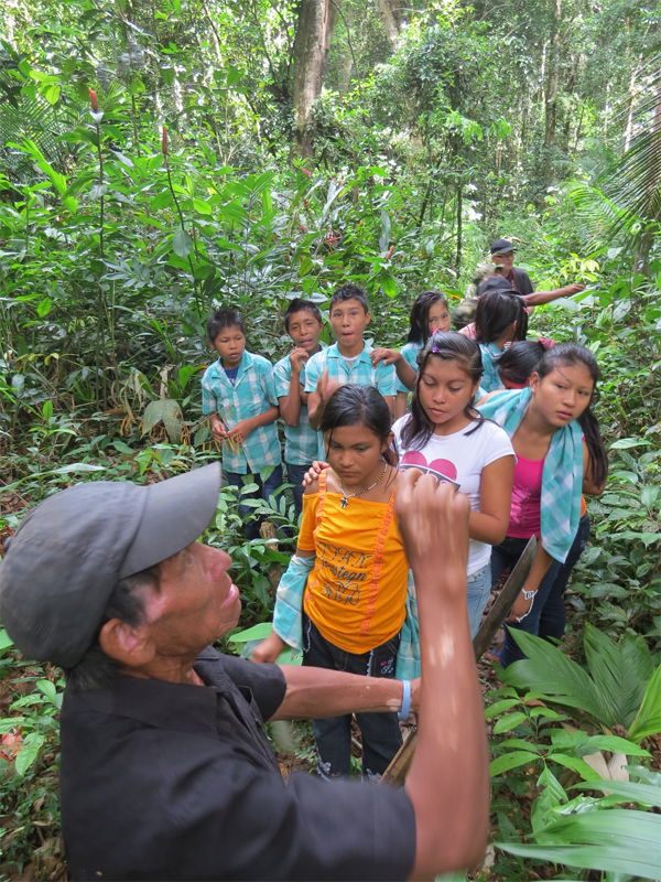 On February 11, 2015, the shaman Korotai Puumona escorted sixth-grade students from the public school in Kwamalasamutu into Suriname’s deep rainforest interior. During the walk, Korotai–an active participant in ACT’s “Shamans and Apprentices” program–introduced the students to a range of medicinal plants. They learned about their forests’ rich ethnobotanical wealth as Korotai pointed out species that are used to disinfect wounds, stem bleeding, treat snake and spider bites, and more.