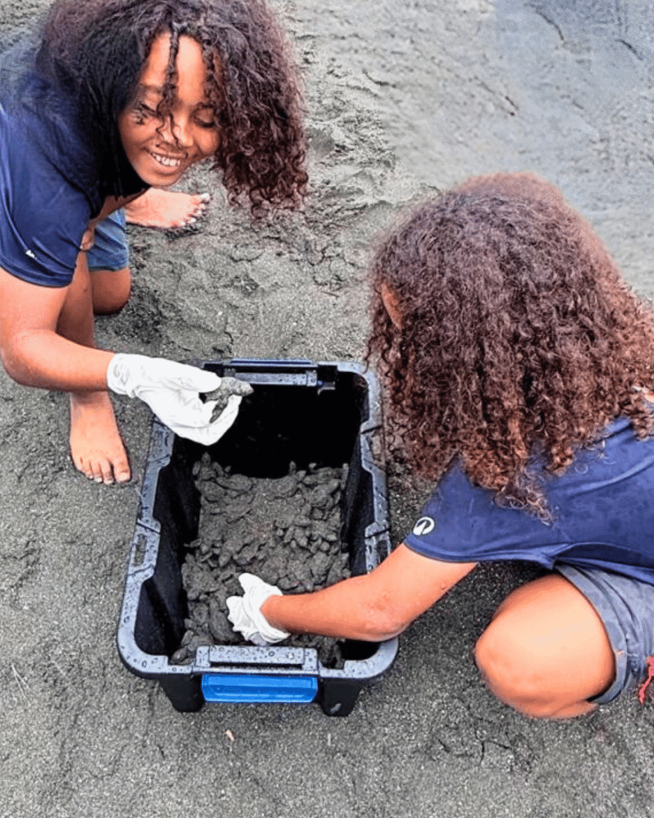 Oli and his sister releasing baby turtles from the Ancestral Tides project.